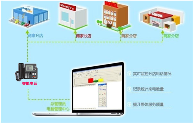 应用方案:1、八百呼电话系统实现单店、多店集中监控管理