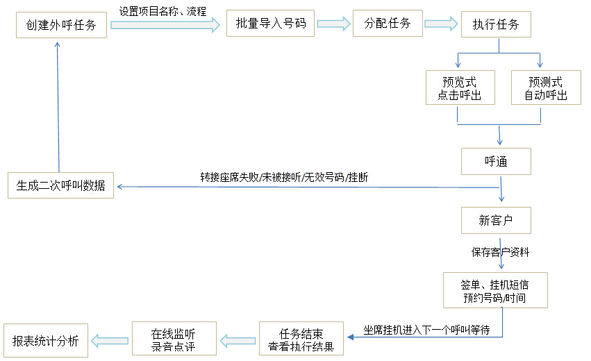 投资理财行业电话外呼型呼叫中心方案,是专门针对主要以外呼为主体的营销模式,结合企业的业务流程,自主研发了一套呼叫中心营销平台,其外呼营销流程如图: