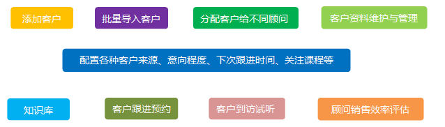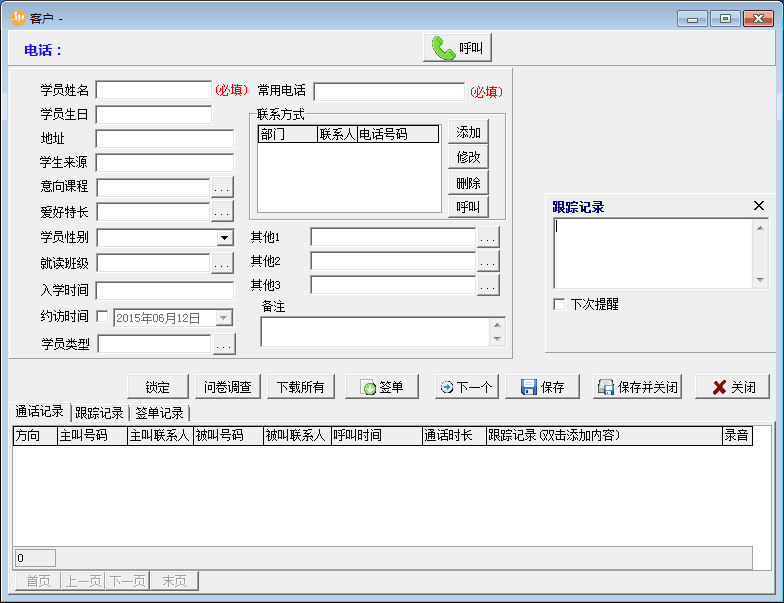客户管理、来电弹屏电话呼叫时,学员姓名、就读学校、意向程度、需求点、以往的谈话记录等。第一时间掌据学员线索,把握谈话的主动权。并设置好下次跟进的时间。