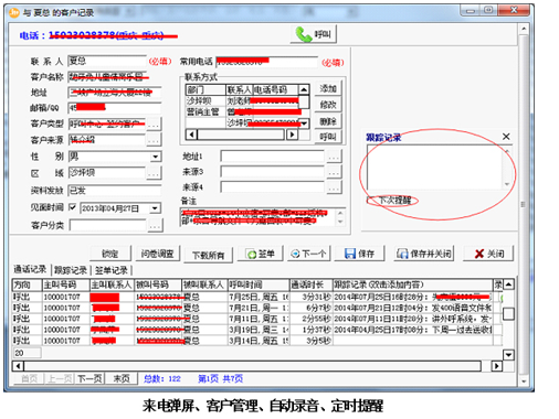 当电话响起,系统会立即在电脑显示屏上弹出用户的资料,姓名、地址,以往的谈话记录、业务关系等。可以效率很高地继续上次的话题,设置下次跟进时间,记住所有的客户,记住所有的承诺,把一切安排得井井有条。